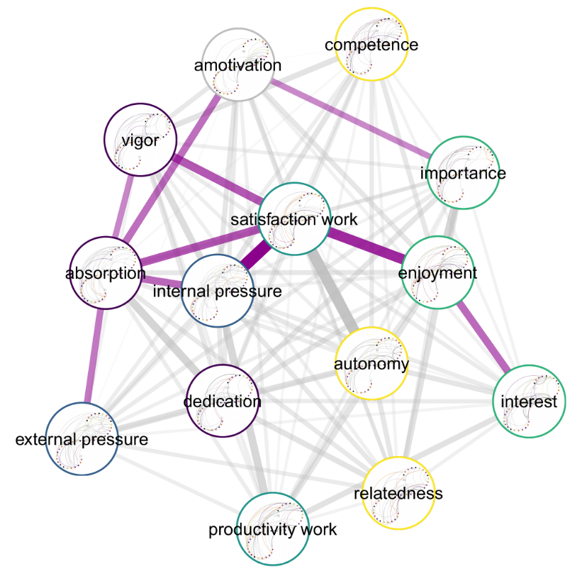 A single person’s multiplex recurrence network, i.e. a network of recurrence networks of work motivation variables queried daily for 30+ days. Colored connectors are relationships which can’t be attributed to randomness.