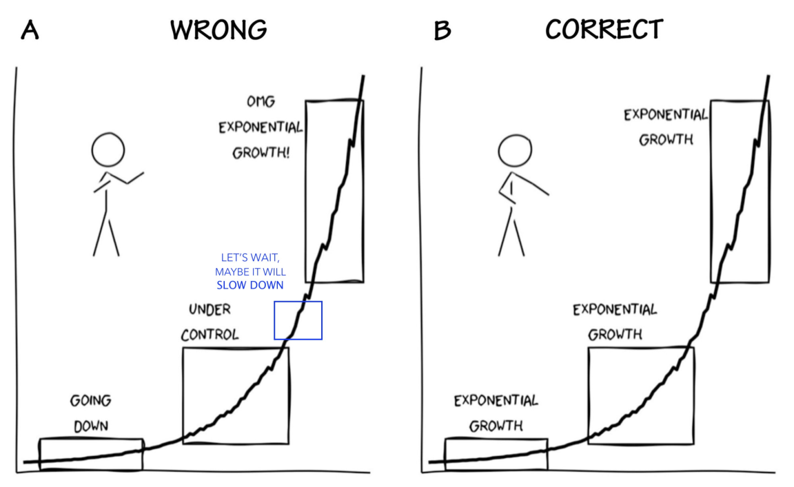 Osa 2: Noususta, tuhosta ja oikea-aikaisuudesta. [Erratum: Eksponentiaalisen kasvun/laskun selityksessä pitäisi tarkalleen ottaen olla ison R:n sijaan pieni r – kyseessä siis eksponentiaalisen yhtälön r-kasvuparametri, ei tartuttavuusluku R0]